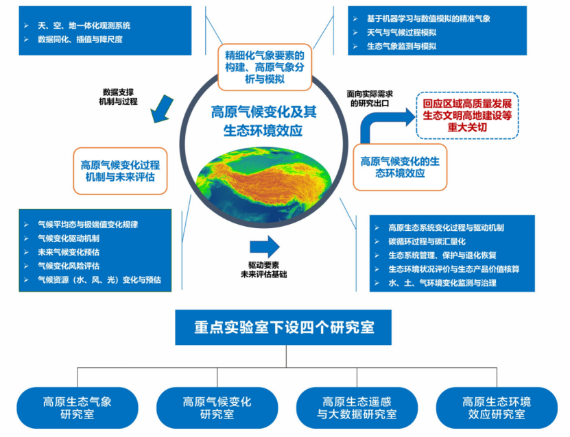 习近平总书记说:“青海最大的价值在生态、最大的责任在生态、最大的潜力也在生态”。青海生态环境脆弱,而生态环境系统的依存要素、变化驱动与预估在于气象与气候条件,绿色资源的本质就是气候资源。在全球变暖的气候背景下,青藏高原气侯升温明显,冻土面积萎缩、生物栖息地退化等问题凸显。因此,青藏高原的气候变化及其生态环境响应与反馈作用亟待解决。本实验室以大气科学为特色、生态环境为主体,旨在面向重大科学问题和服务地方战略需求,建成立足高原、面向全国的高水平科研平台。